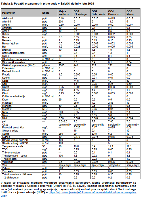 Vrednosti posameznih parametrov pitne vode po oskrbovalnih območjih so prikazane v Tabeli 2.