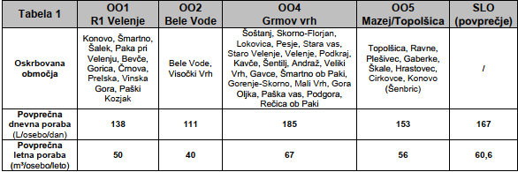 Še informacija o ceni pitne vode: Cena 1 m3 vode je 1,0631 EUR (z vključenim 9,5 % DDV). Povprečna poraba pitne vode v Sloveniji znaša 167 l/osebo/dan oz. 60,6 m3/osebo/leto. Podatki o porabi vode za oskrbovalna območja v Šaleški dolini so predstavljeni v Tabeli 1. Uporabniki lahko svojo mesečno porabo vode spremljajo na položnicah ali v Portalu za uporabnike na spletni strani Komunalnega podjetja Velenje.