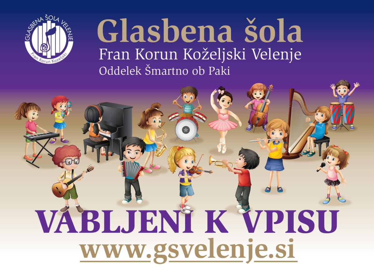 v Glasbeni šoli Velenje – oddelek Šmartno ob Paki odpiramo vrata novim glasbenicam in glasbenikom. Vabimo vas, da svojemu nadobudnežu, nadobudnici omogočite obiskovanje glasbene šole. Na naši spletni strani www.gsvelenje.si najdete vse potrebne informacije o programih in vpisu. Veselimo se druženja z vašimi otroki - našimi bodočimi učenci.